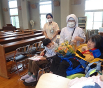 山田神父様にお祝いの言葉を添え、花かごと色紙を渡してきました。