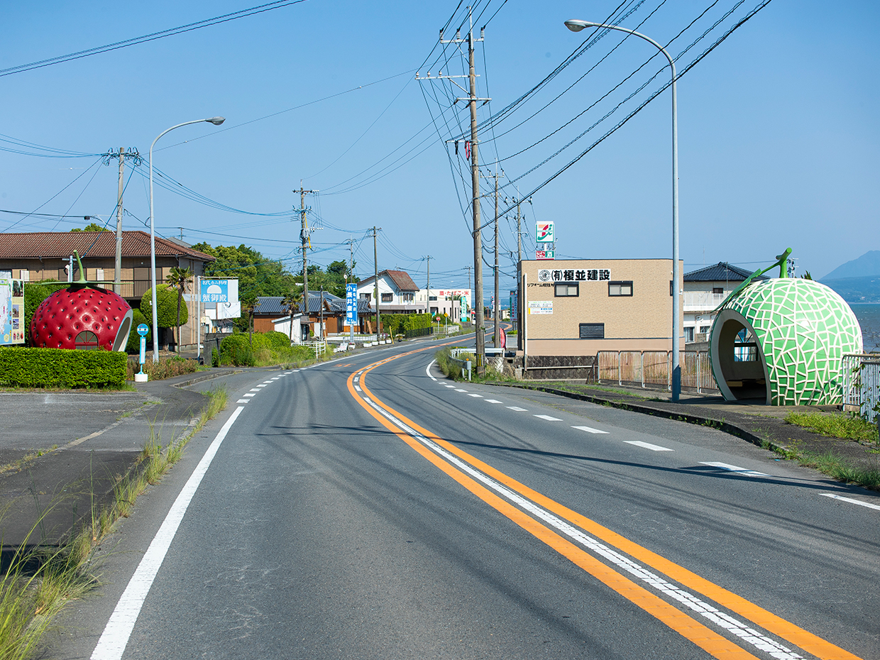 国道207号線長里駅付近から小長井駅方面に向けて進むと、イチゴとメロンの形をしたバス停留所「平原」があります。