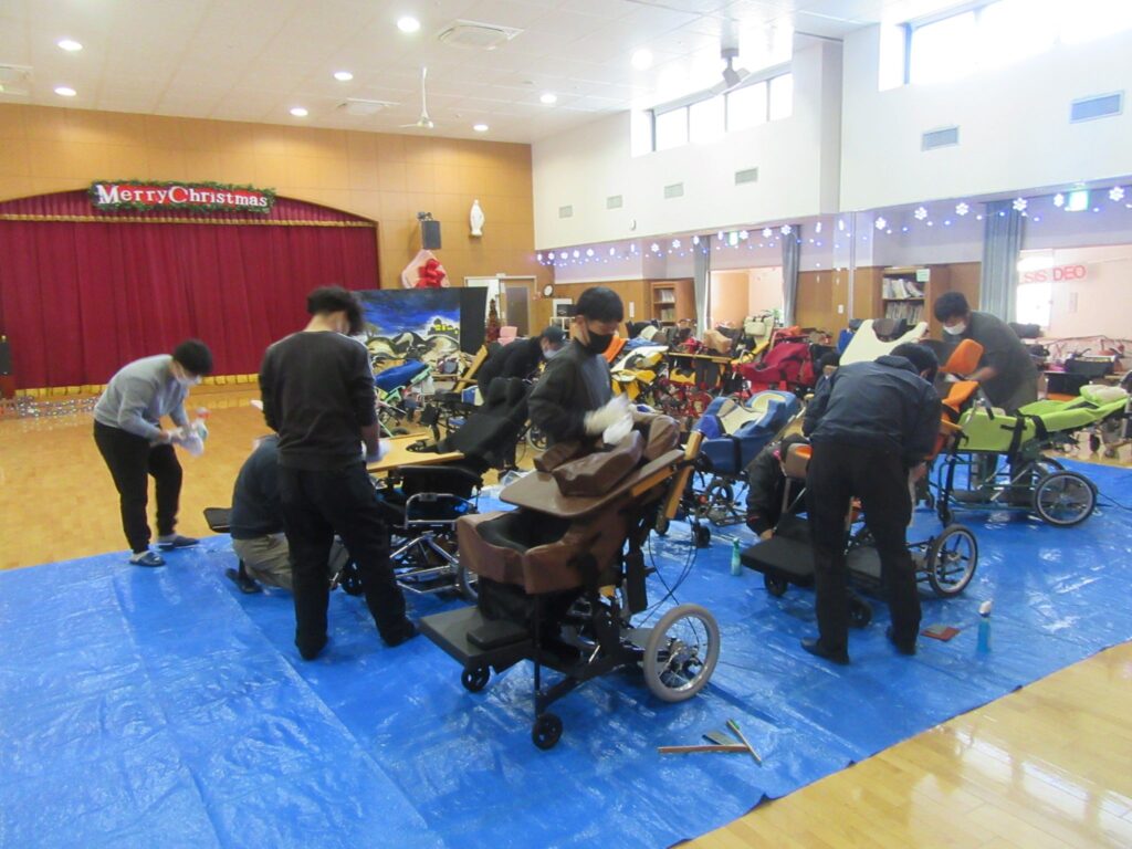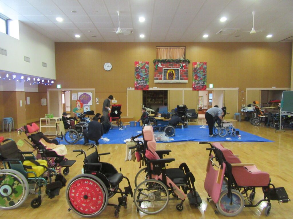 12月20日(土)に、三菱重工グループ労働組合連合会長崎地区の皆様が、ふれあいボランティアに来られました。今回も、8名の皆様で車椅子の清掃と、児童発達支援センターの利用者様と触れあっていただきました。